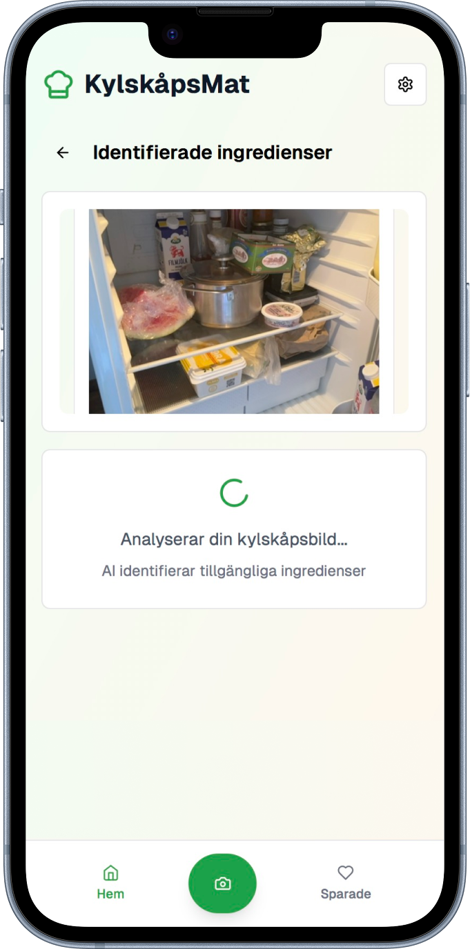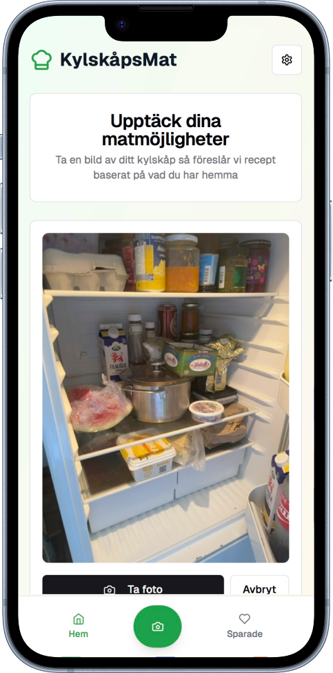 Appens design är enkel och intuitiv. Användaren möts direkt av en tydlig rubrik som förklarar syftet, ta en bild av ditt kylskåp och få receptförslag.