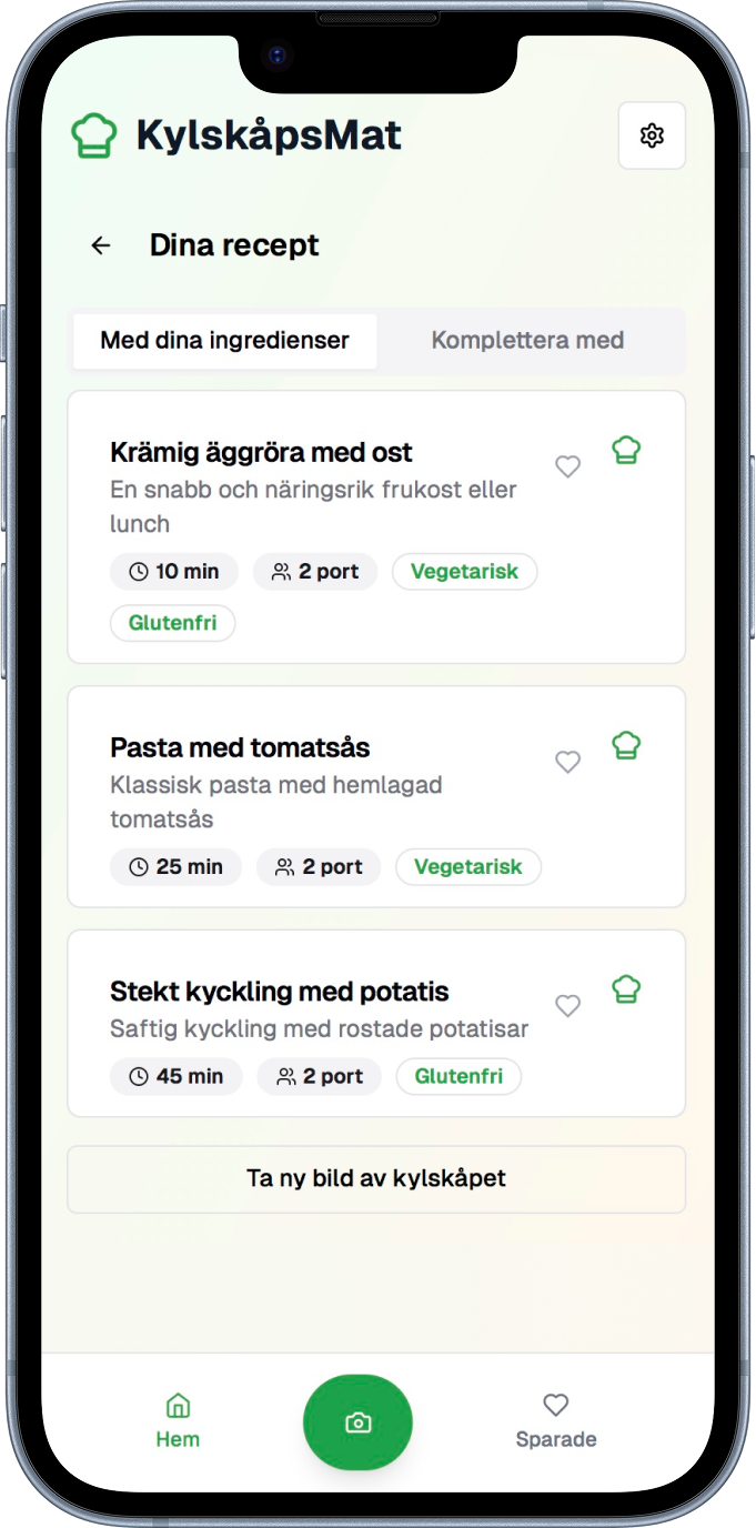 Enkel och funktionsinriktad recept sida, vilket effektivt stödjer appens syfte att underlätta matlagning med tillgängliga ingredienser från användarens egna kylskåp.